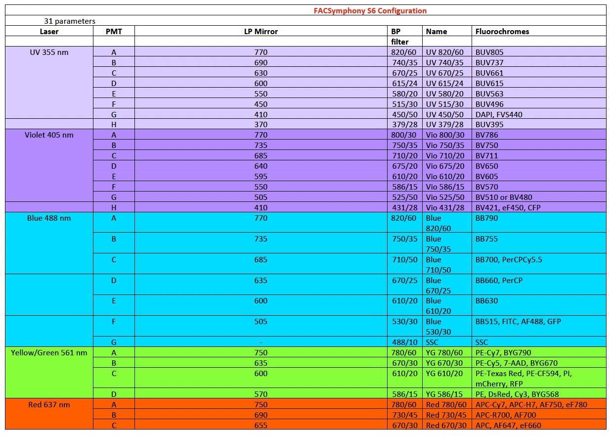 The BD FACSymphony™ S6 is a high-performance cell sorter that combines the reliability of the FACSAria Fusion platform with advanced optical capabilities from the FACSymphony A5 Analyzer. This versatile research instrument supports 5 lasers (355nm, 405nm, 488nm, 561nm, and 637nm) and 29 fluorescent detectors, enabling deep phenotypic characterization of complex cell populations. The system features six-way simultaneous sorting into multiple tube formats and on plates 6, 12, 24, 48, 96 and 384 wells, significantly increasing experimental throughput. Equipped with temperature-controlled sample handling and housed within a BSL-2 biosafety cabinet, the S6 provides an aseptic environment for sensitive cell sorting applications. Its flexible configuration supports a wide range of experimental designs, from basic immunophenotyping to high-dimensional single-cell analysis, making it an indispensable tool for advanced cell biology research within our core facility.