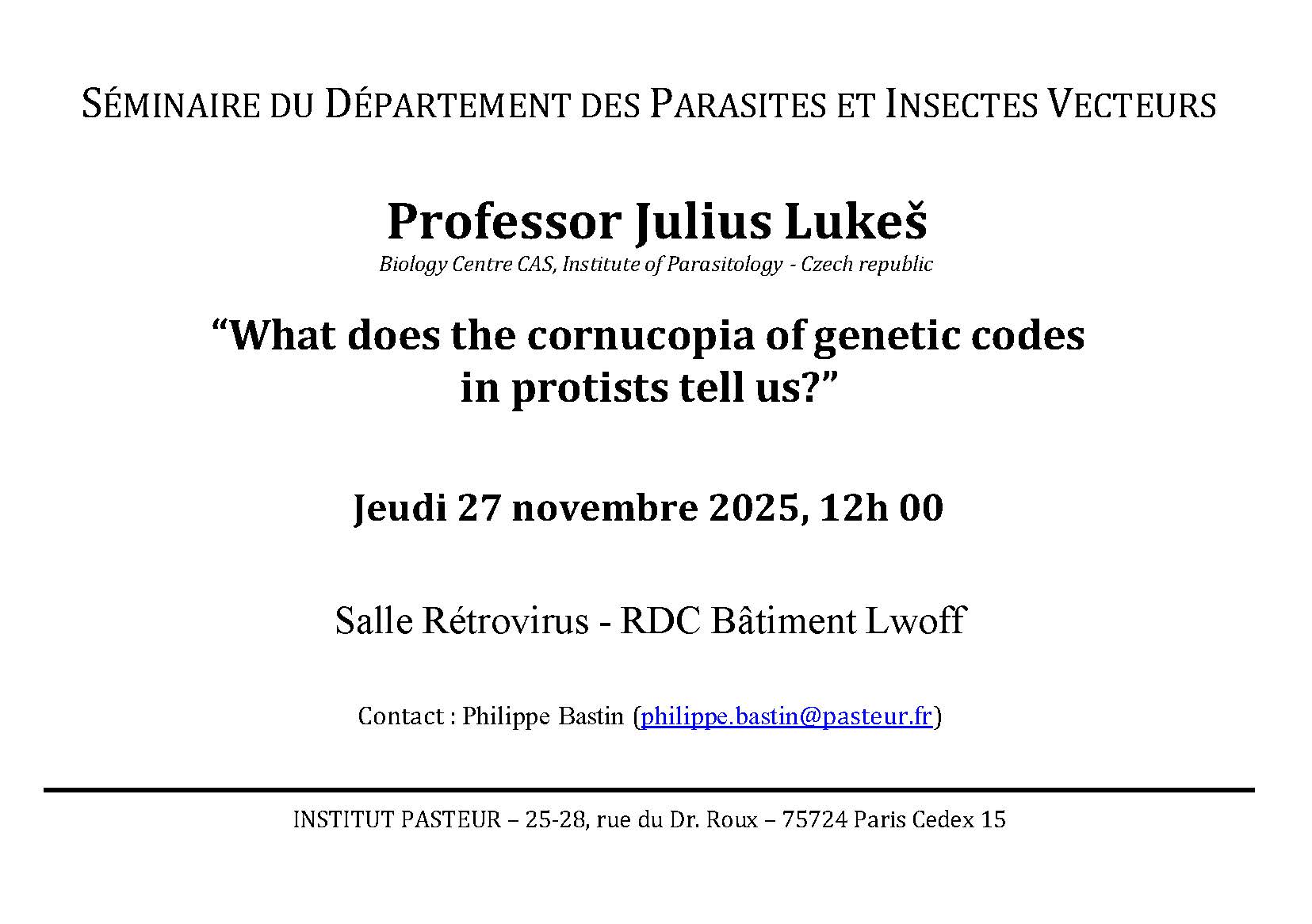 2025-11-27 12:00:00 2025-11-27 13:00:00 Europe/Paris Department of Parasites and Insect Vectors Seminar : Julius Lukeš “What does the cornucopia of genetic codes in protists tell us?” The canonical genetic code contains 61 sense and 3 nonsense (stop) codons. Although it is almost universal, about 60 different genetic code variants have been described so far. Majority of these alterations evolved in […] Institut Pasteur, Rue du Docteur Roux, Paris, France Philippe Bastin philippe.bastin@pasteur.fr