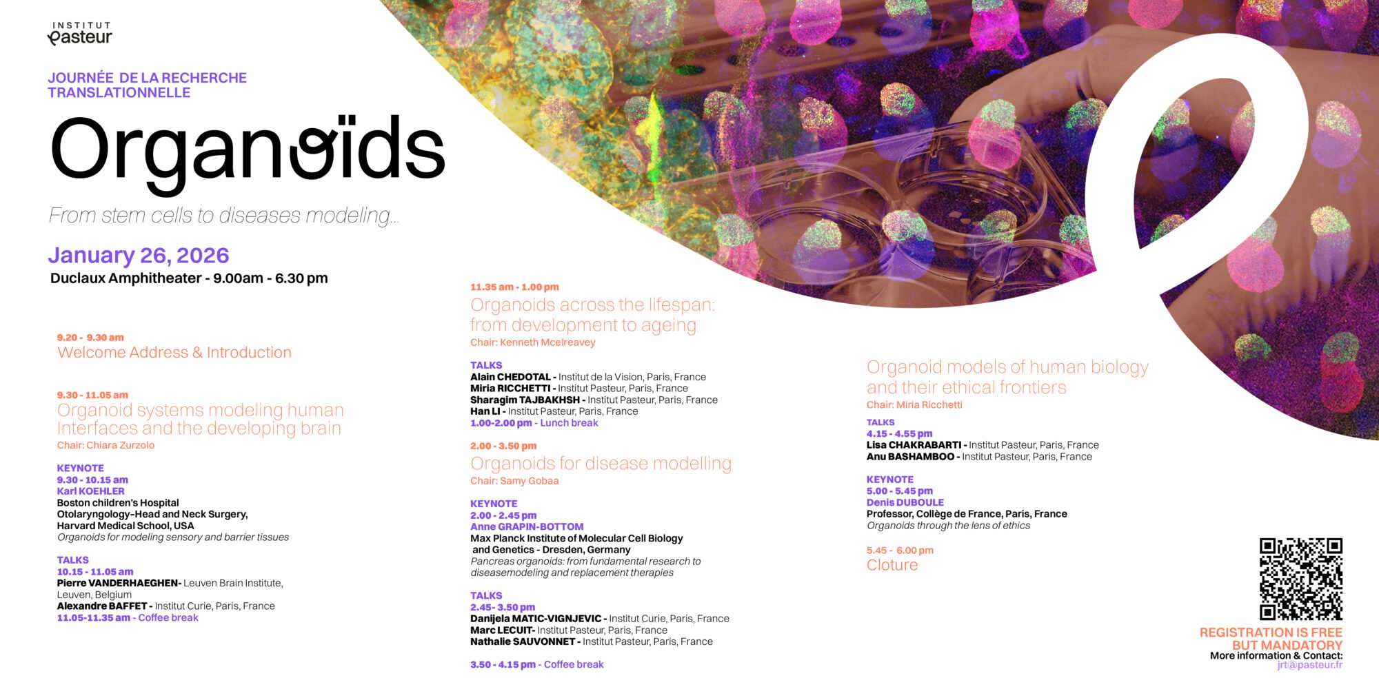 2026-01-26 09:20:00 2026-01-26 18:30:00 Europe/Paris JOURNÉE DE LA RECHERCHE TRANSLATIONNELLE “Organoids : from stem cells to diseases modeling…” January 26, 2026Duclaux Amphitheater – 9.20am – 6.00 pm An english in person symposium organised since 2015 by the Medical Direction dedicated to translational research. Free but mandatory registration : link to register 28 Rue du Dr Roux, Paris, France Angélique Michaut angelique.michaut@pasteur.fr