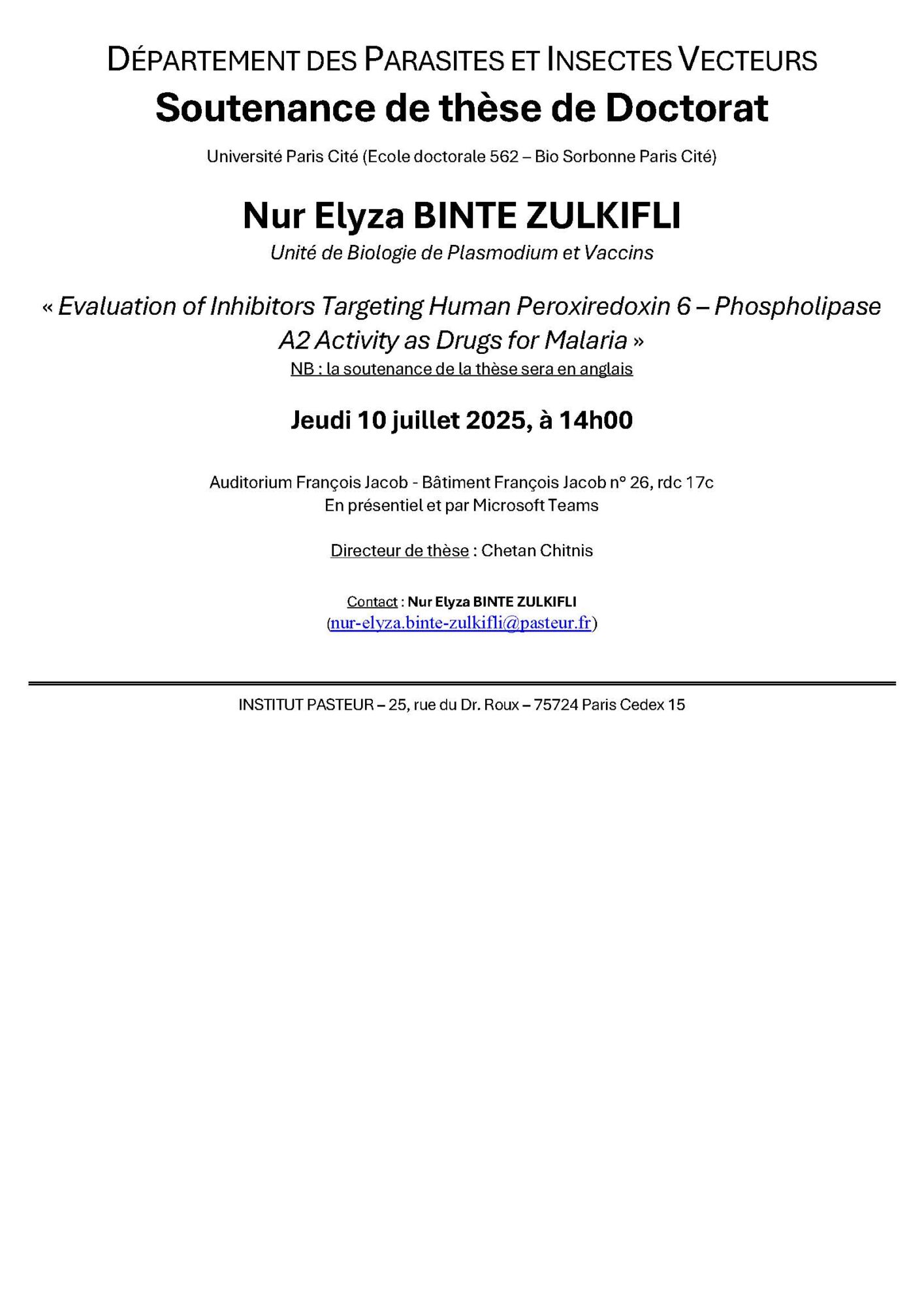 Address: Institut Pasteur, Rue du Docteur Roux, Paris, France