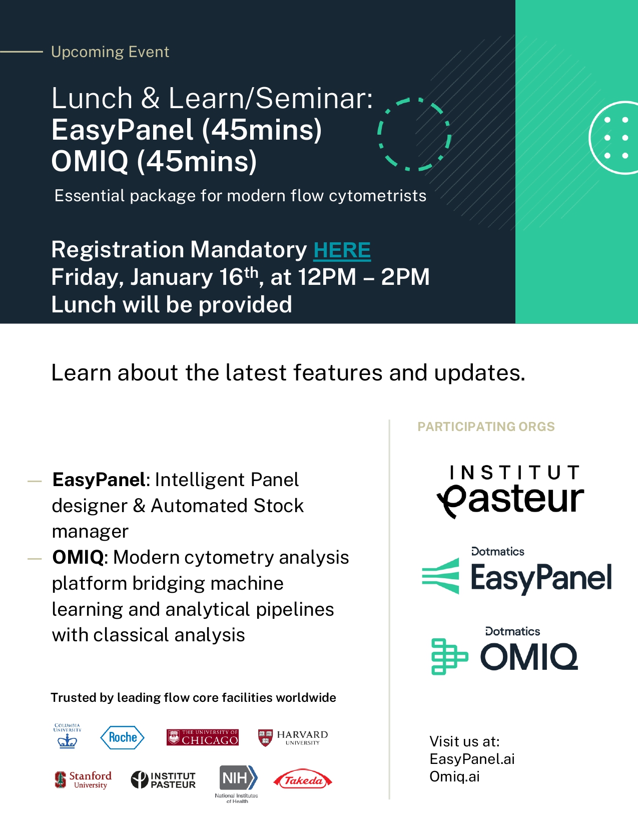 We are hosting EasyPanel‘s and OMIQ‘s teams for a Lunch & Learn on the respective software updates/new features on Friday, January 16th from 12–2PM in the room 28-01-01E.