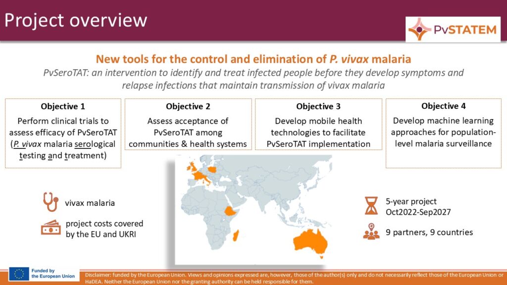 The overall objective of PvSTATEM is to implement a cluster-randomized trial in Ethiopia and Madagascar to demonstrate the effectiveness of a new anti-malaria intervention based on P. vivax serological testing and treatment (PvSeroTAT) with primaquine to prevent the relapse infections responsible for maintaining P. vivax transmission. In parallel, the consortium will evaluate community acceptability of PvSeroTAT, innovate mobile technologies for efficient implementation of PvSeroTAT (mHealth approach), and develop machine learning approaches for population-level malaria surveillance.