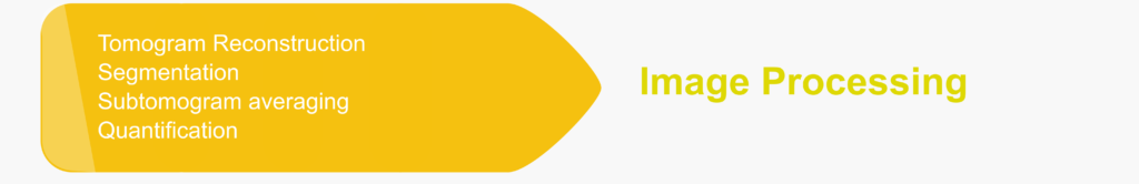 Typically, reconstruction of electron tomograms consists of five steps; pre-processing, estimation of initial image shifts, preparation of the fiducial model and tilt-series alignment, post-processing, and reconstruction. In case of dual axis tomography the tomographic volumes from each axis are build separately and combined in a final step.