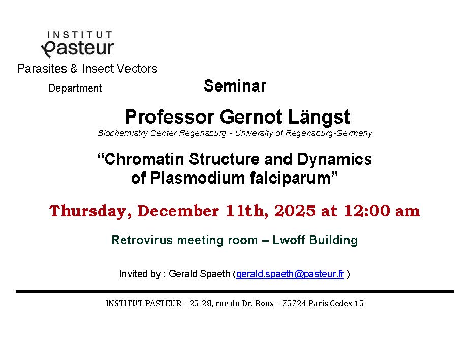 2025-12-11 12:00:00 2025-12-11 14:00:00 Europe/Paris Department of Parasites and Insect Vectors Seminar : Professor Gernot Längst “Chromatin Structure and Dynamics of Plasmodium falciparum” Abstact : The highly complex life cycle of the human malaria parasite, Plasmodium falciparum, relies on an orchestrated and tightly regulated gene expression programme. The access of regulatory factors to DNA is controlled by its packaging […] Institut Pasteur, Rue du Docteur Roux, Paris, France Gérald Spaeth gerald.spaeth@pasteur.fr