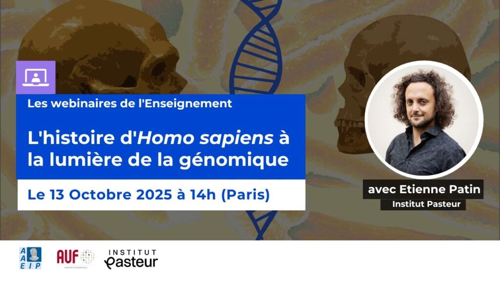 2025-10-13 14:00:00 2025-10-13 15:30:00 Europe/Paris Les Webinaires de l’Enseignement – L’histoire d’Homo sapiens à la lumière de la génomique – Etienne Patin Grâce aux avancées récentes de la génomique moderne et de l’ADN ancien, les chercheurs lèvent peu à peu le voile sur 10 000 ans d’histoire démographique humaine, faite de vagues migratoires de grande ampleur […] Etienne Patin etienne.patin@pasteur.fr