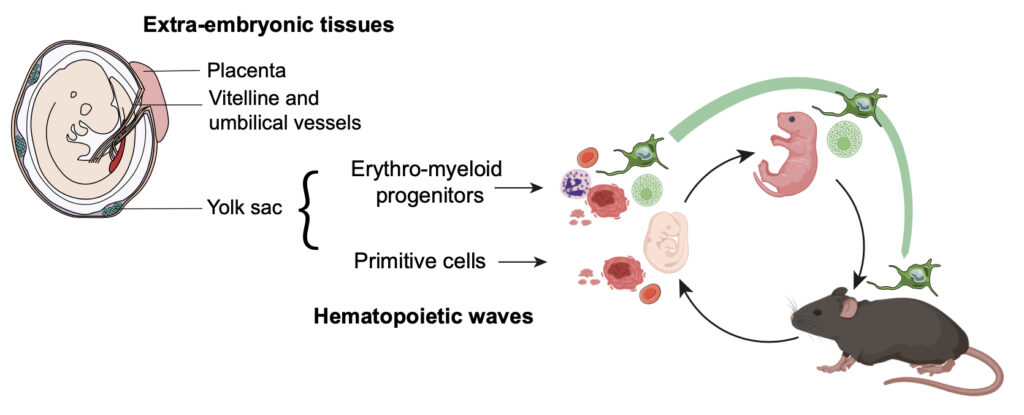The first blood and immune cells in vertebrates emerge in the extraembryonic yolk sac. Throughout the last century, it has become evident that this extraembryonic tissue gives rise to transient primitive and definitive hematopoiesis but not hematopoietic stem cells. More recently, studies have elucidated that yolk sac-derived blood and immune cells are present far longer than originally expected. These cells take over essential roles for the survival and proper organogenesis of the developing fetus up until birth. In this review, we discuss the most recent findings and views on extraembryonic hematopoiesis in mice and humans.